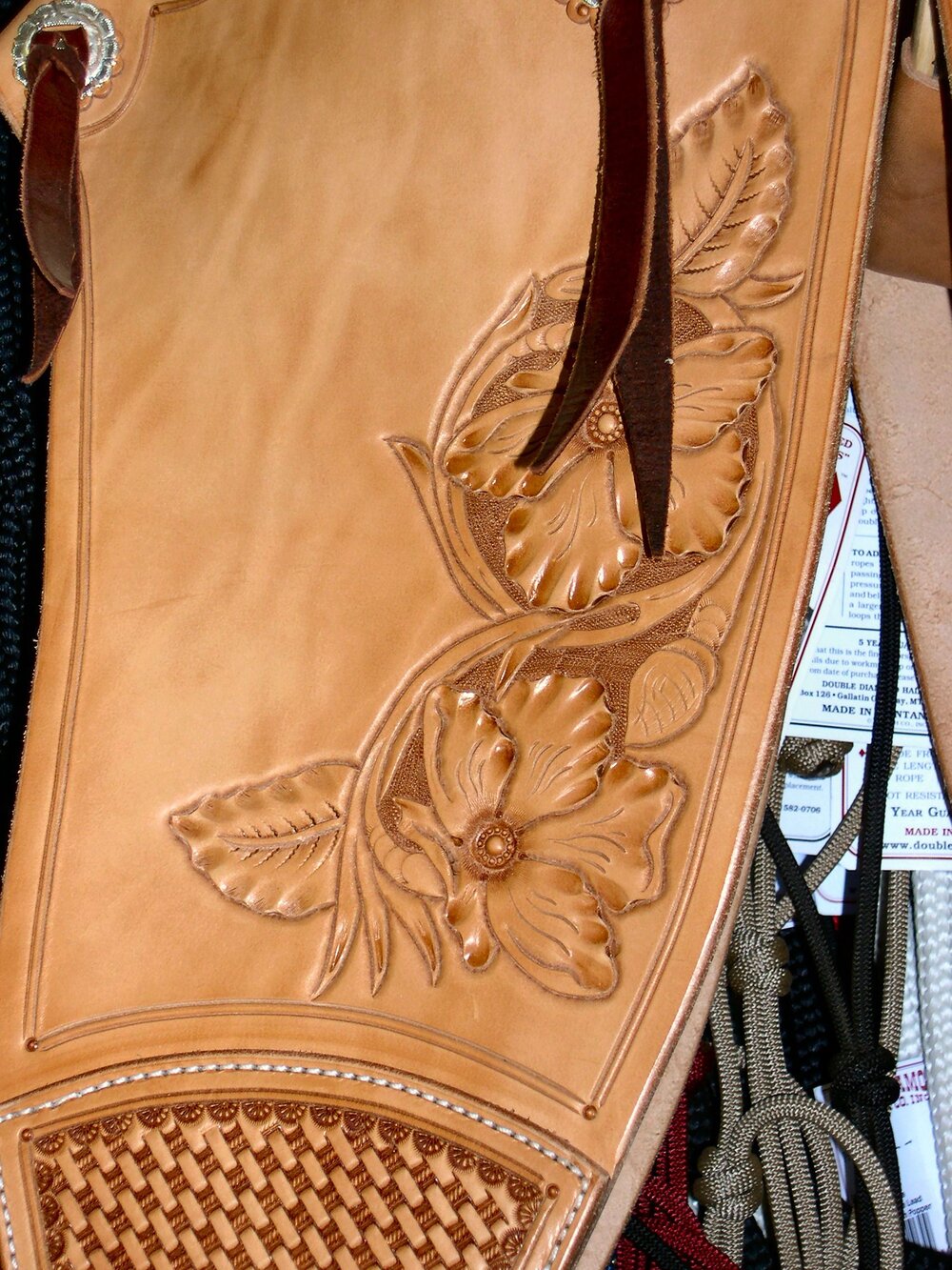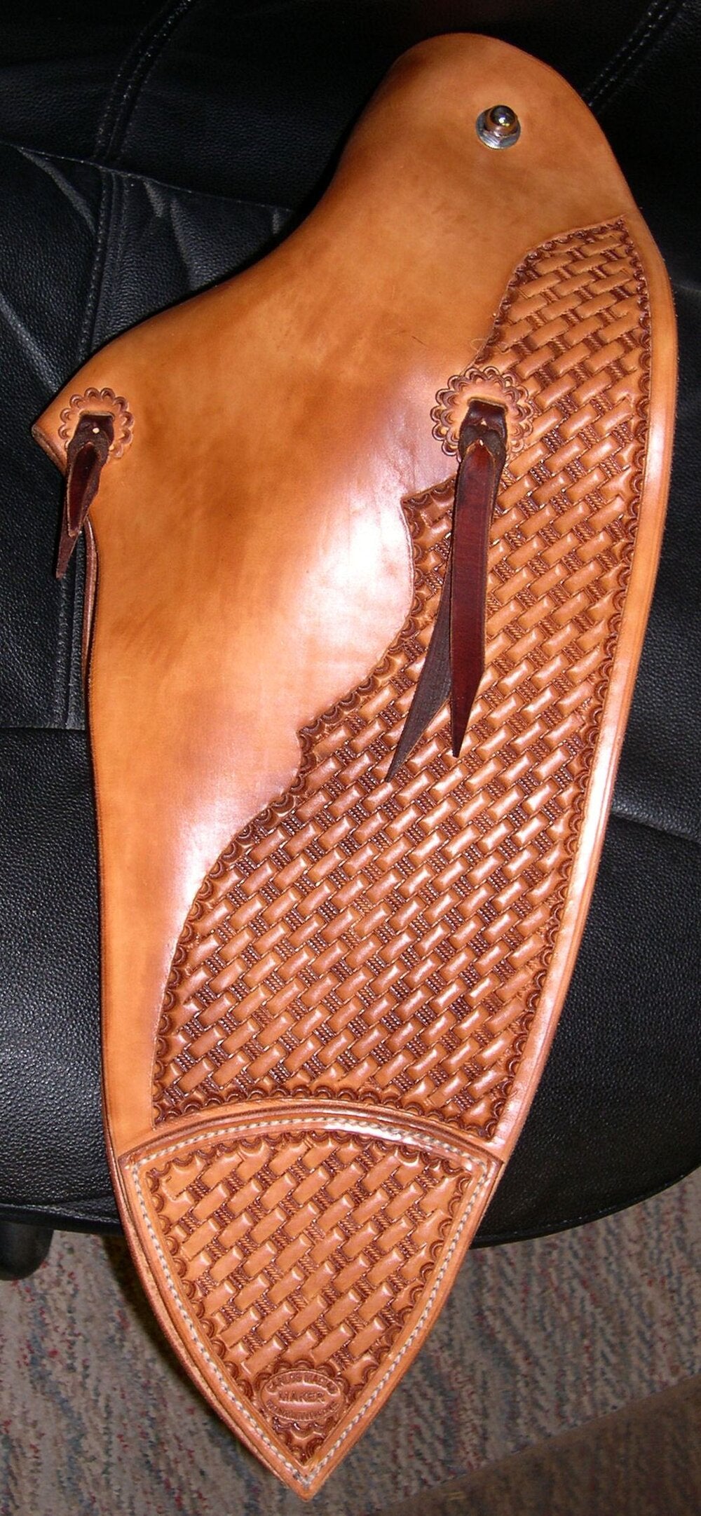Our Tapaderos are made of the finest heavy skirting leather with a 3-1/2" tin bound bell stirrups.Base Price: $600 (Plain Roughout or Smoothout)