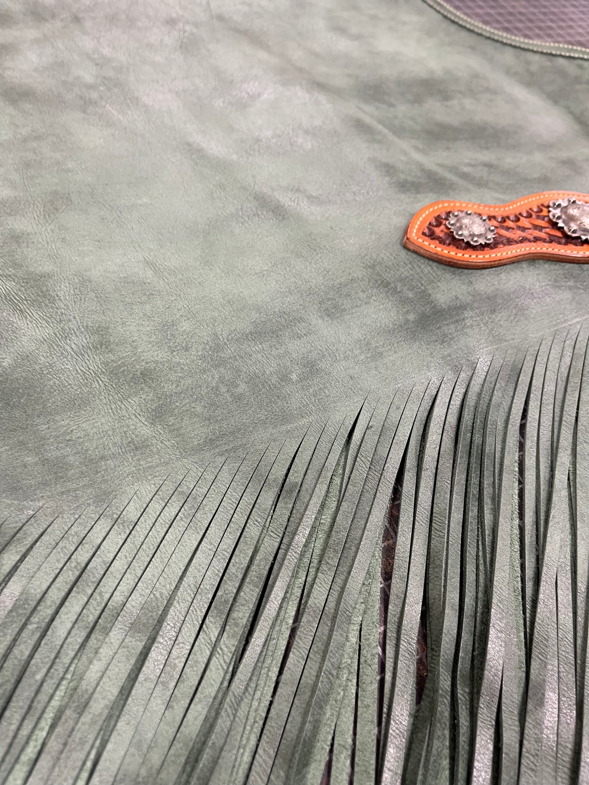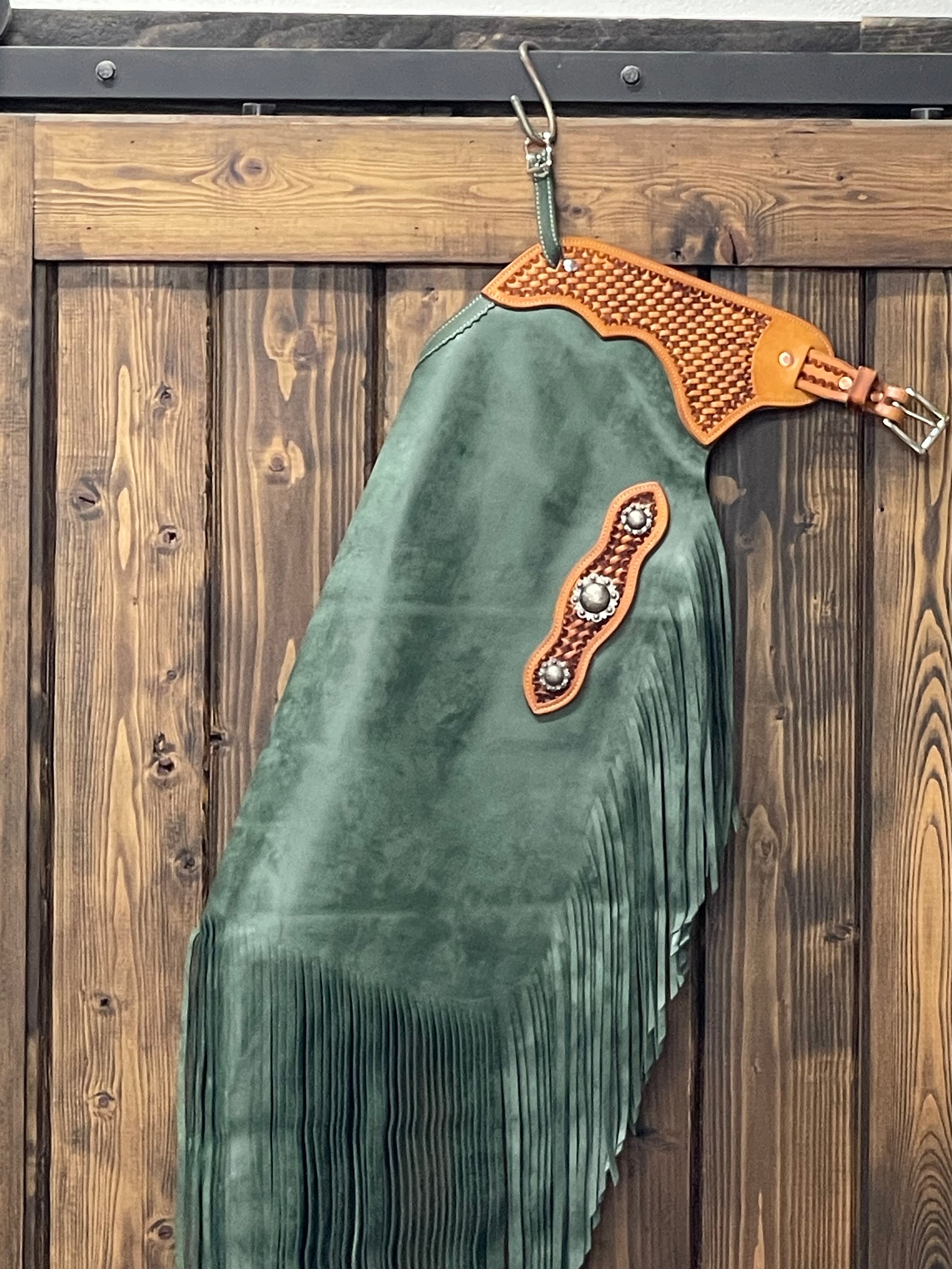 These chinks are made of a very unique lighter weight distressed green colored hide, classic basket stamped tops and leg plates, finished with antiqued nickel conchos.