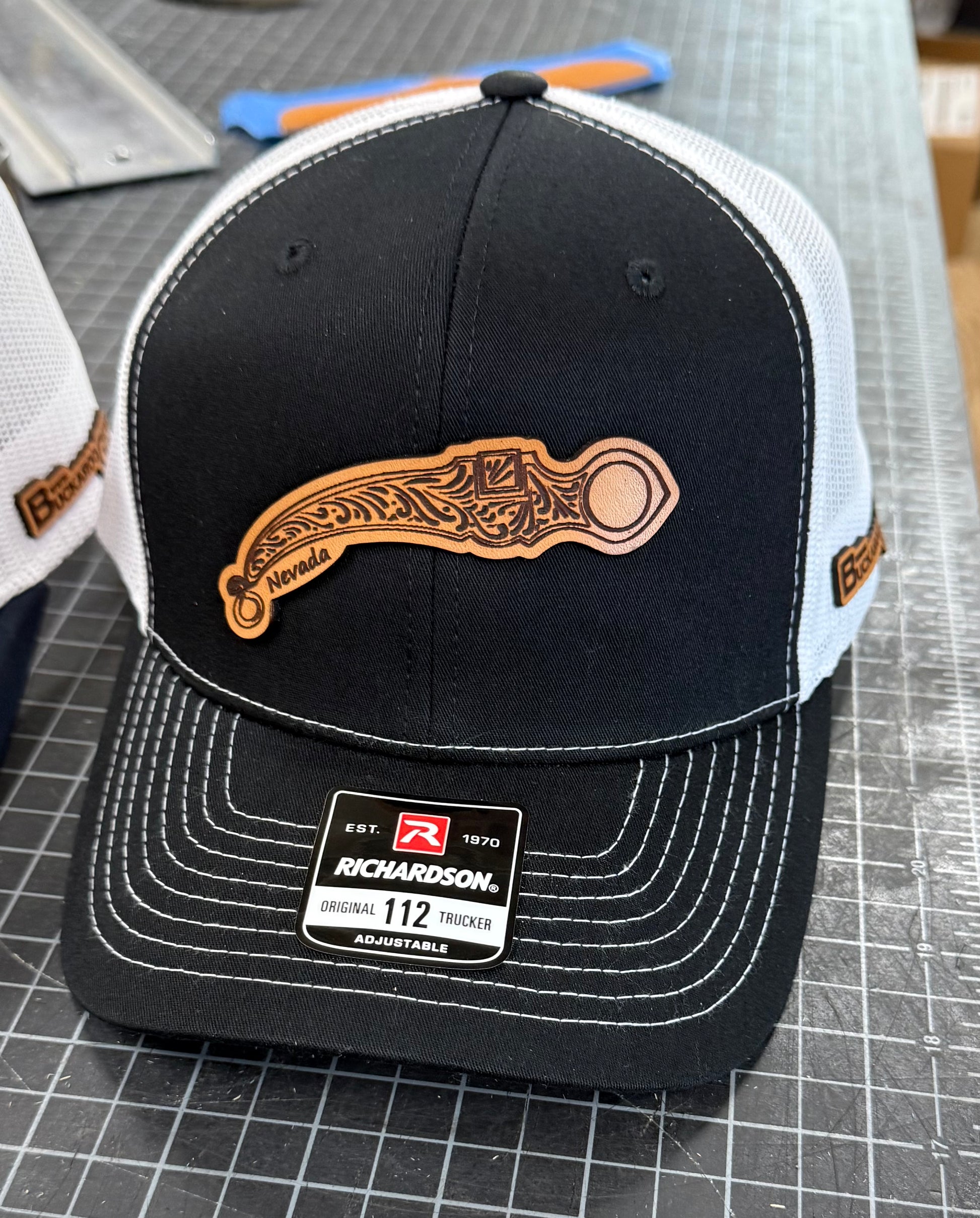 None other than the popular Richardson 112 Cap, featuring one of the staple traditional bridle bit cheek styles. With left side BuckarooGear logo. Patches are engraved on genuine Herman Oak Leather. Laser engraved adhesive backed and heat pressed here in the shop. Black/White
